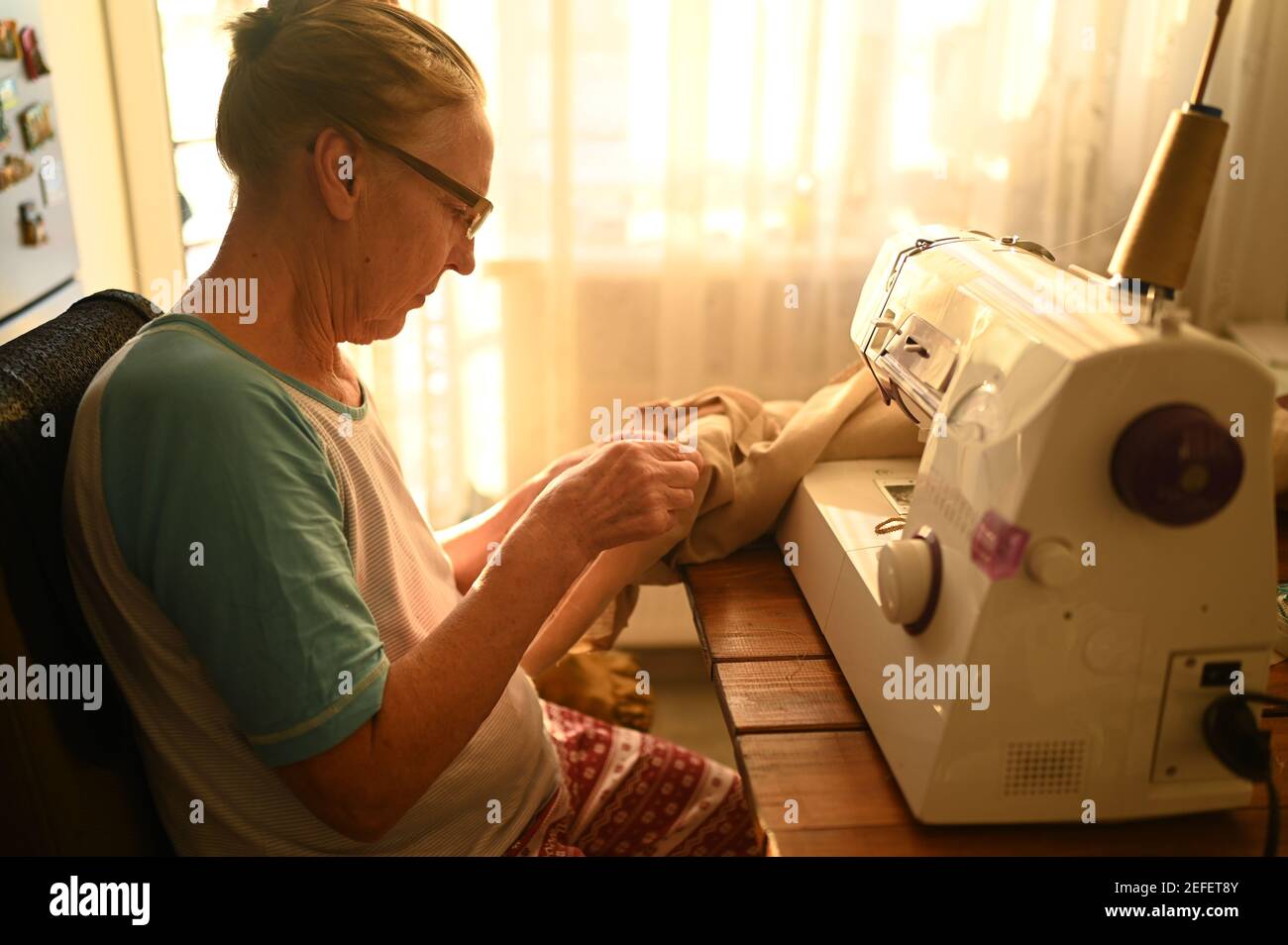 Confident Senior Elderly Woman Seamstress White Shirt And Glasses Sitting In Front Of Sewing Machine Working On Clothes At Home Using Beige Fabric Retired People Age Job Occupation Concept Stock Photo